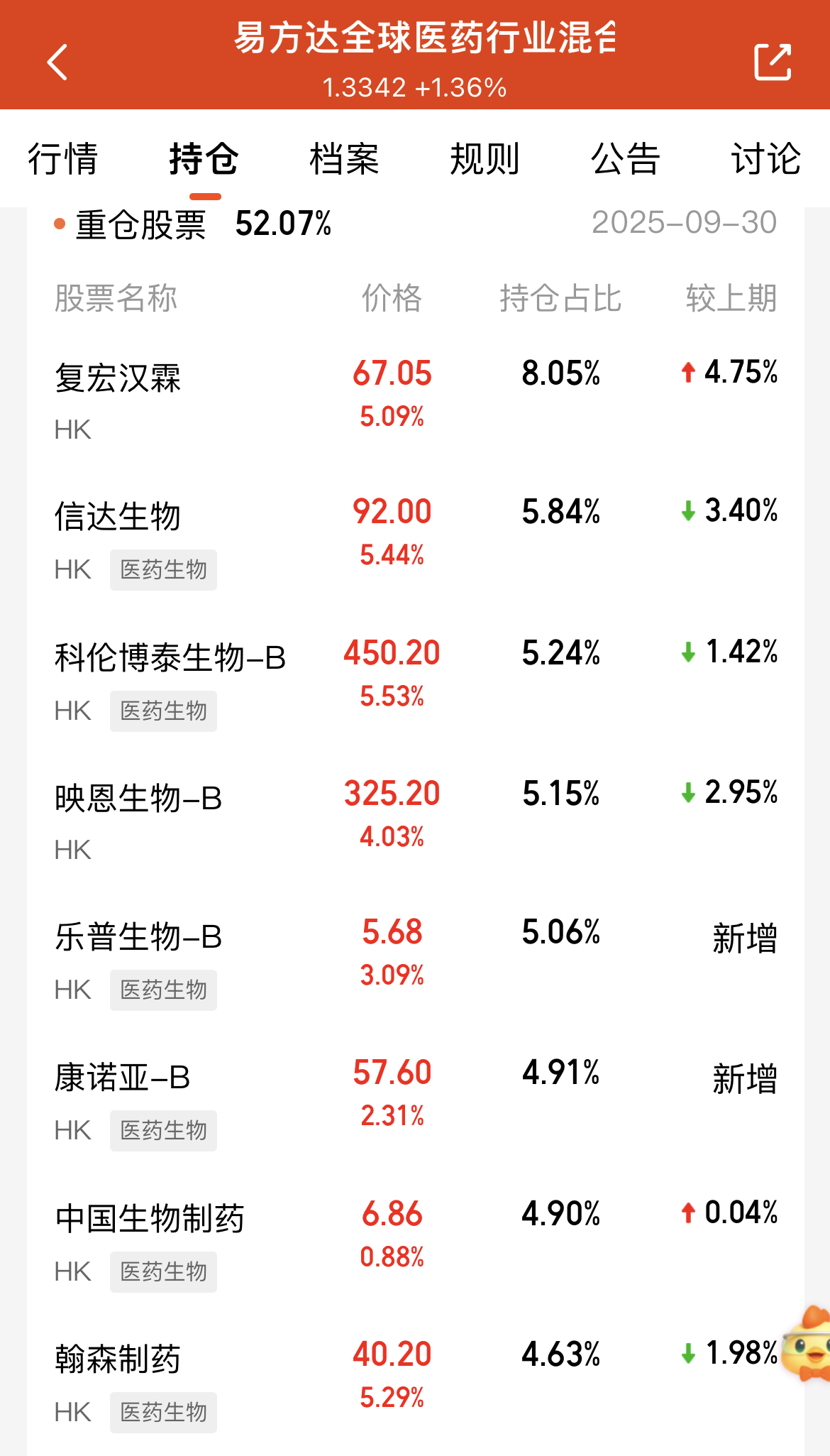 今天大盘和港股都明显回暖,市场超4200只个股上涨,创新药板块表现出色,医药行业的基本面韧性十足,后续的机会还是值得把握的。易方达全球医药行业混合发起式A,今年涨幅超85.25%,亮点是能全球挑选医药龙头,基金经理是医药博士,调仓灵活,这波反弹里用它来抓住医药机会还是不错的,我也分批布局起来。