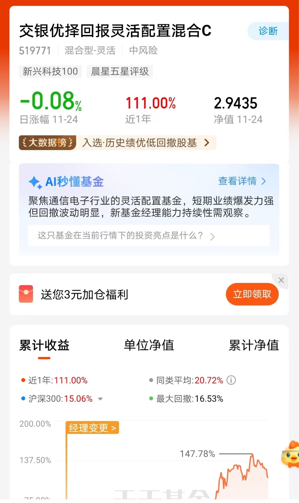最近科技板块利好消息不断,从人工智能到新能源车,产业链上下游都在爆发式增长。我这只基过去一年居然跑出了111%的收益率,简直像坐上了火箭!看着它净值曲线稳稳踩着沪深300和同类平均,这种灵活调仓的策略确实有意思—既能在热门赛道里冲浪,又能在市场波动时灵活转身,比死守某个板块自在多了。虽然市场热点轮动像时装周潮流变得快,但通过专业团队及时捕捉机遇,这种步步为营的增长方式让我对后市挺有期待。毕竟能跟着时代浪潮成长,又不必时刻盯盘,这样的体验确实让人心情愉悦。$华泰柏瑞质量精选混合C$ 未来可期$华商均衡成长混合C$ 棒棒哒$博时回报严选混合C$ 继续保持