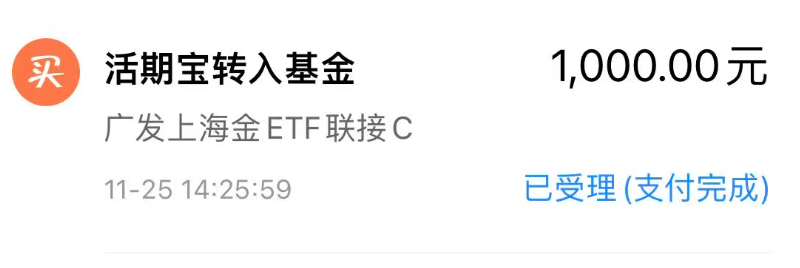 买入1000元$广发上海金ETF联接C(OTCFUND|008987)$,美联储12月大概率是不会降息了,近期黄金调整也比较多,但是全球股市现在震荡都比较大,资金又开始回流到黄金里面,所以现在黄金开始反弹了,现在是不错的加仓时机。黄金其实不太用担心,长线来看是要继续上涨的,华尔街等机构给到的预计是到5000美元/盅司,我们作为底仓配置的话,在4300美元以下问题都不大的。