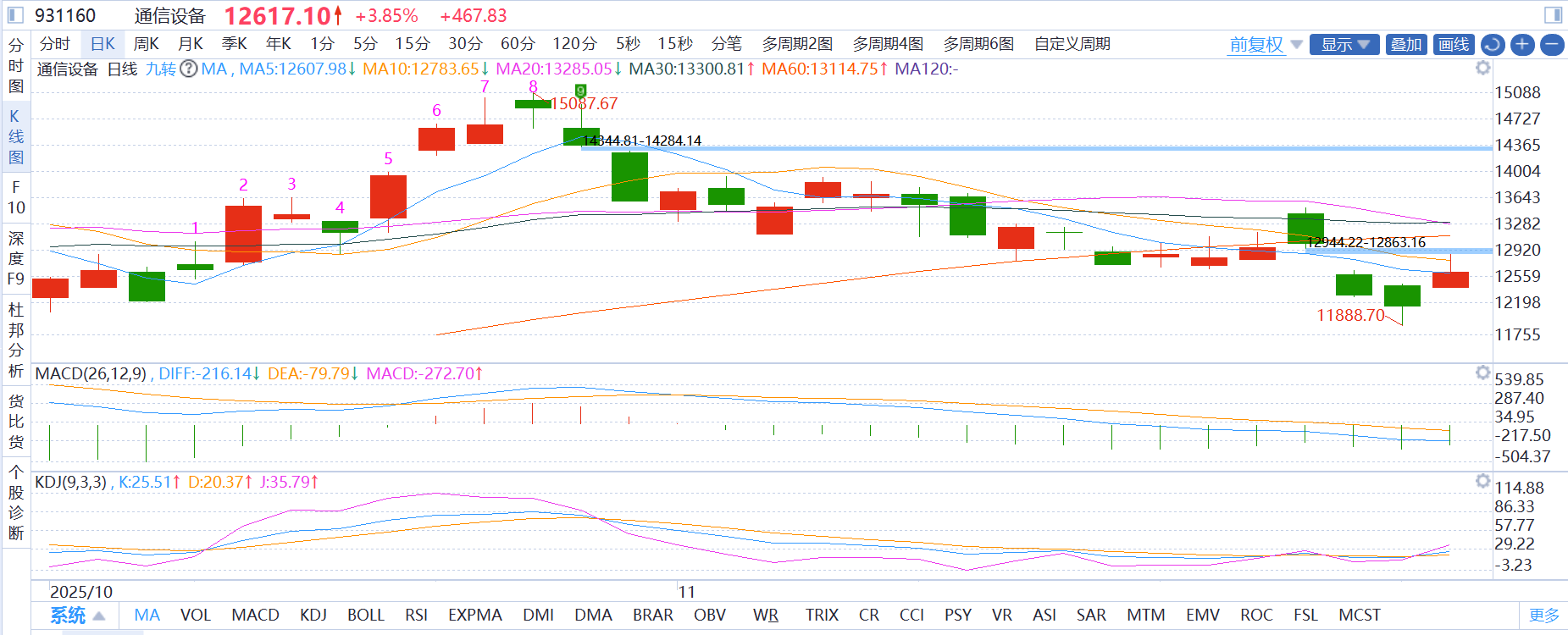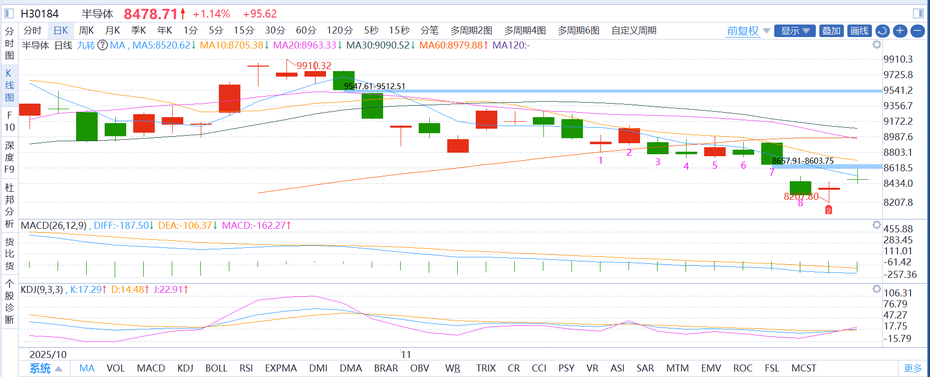 半导体:半导体这两天加对了,今天跟着科技板块发力,AI芯片、光通信模块领涨,技术面突破前期震荡区间,量价齐升,多头趋势明显。虽然午后回落,但是技术面指标,日线MACD二次翻红,加上底部十字星,短线动能充足。继续看涨,麦爸继续持仓观望。