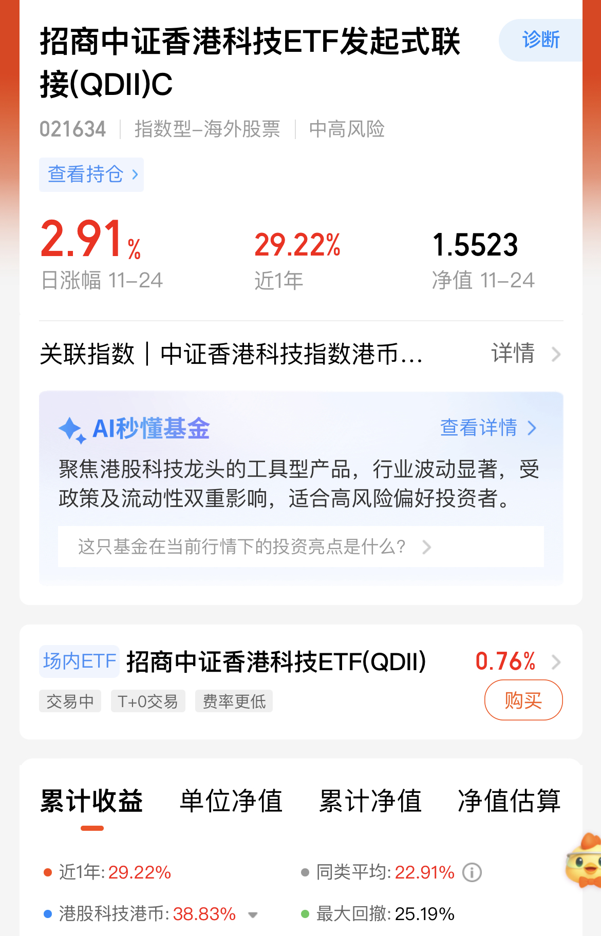 隔夜美股大涨,今日A股、港股延续涨势,市场重回暖意。高盛预计美联储12月将降息,资金会优先流入港股新兴市场,港股科技有望率先受益。我准备加仓$招商中证香港科技ETF发起式联接(QDII)C(OTCFUND|021634)$,它聚焦港股龙头科技,昨日大涨近3%,实时估值继续稳涨,涨幅远超恒生科技,后续潜力可期。