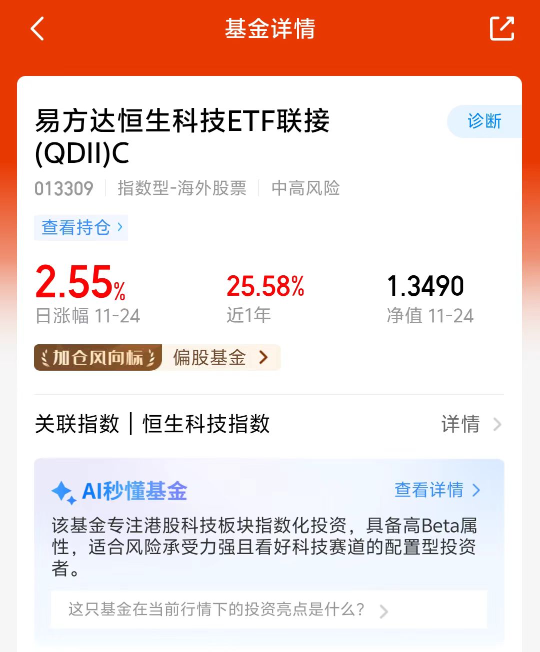 大盘今天继续上涨,港股表现也很不错,恒生科技昨天涨了不少,今天继续上涨!恒生科技指数持仓涵盖了互联网、电子制造、半导体、人工智能、云计算、新能源汽车等细分行业,长期来看发展前景还不错,易方达恒生科技C昨天涨了2.55%,看好这个方向,我准备继续分批布局了!