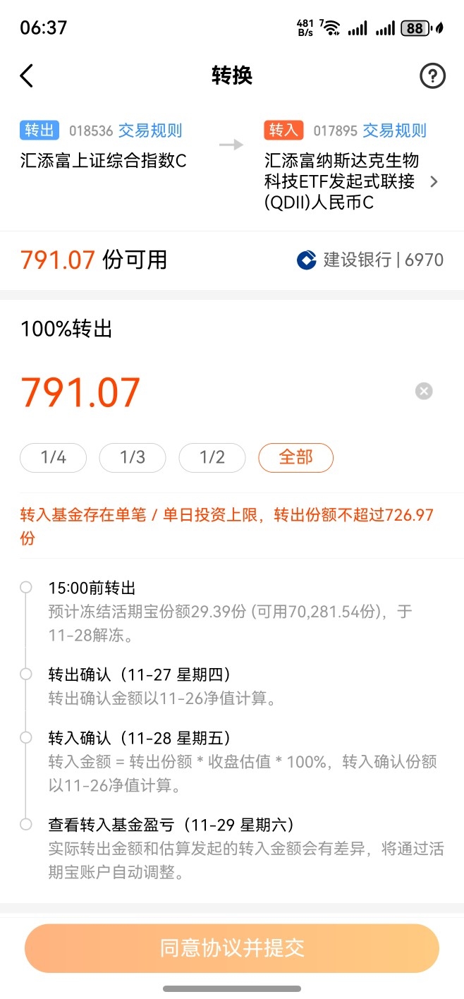 在今天,打算提前操作减掉卖掉这某个上证综合指数基金。打算选择调仓,转到目前持有的某个纳斯达克生物科技指数qdll基金的打算的。