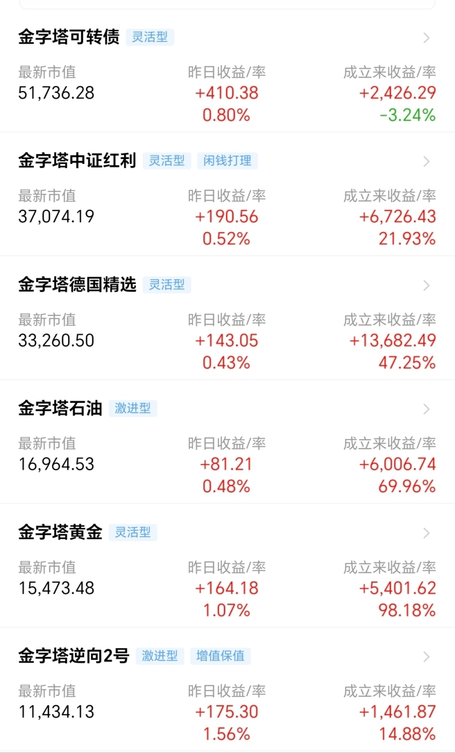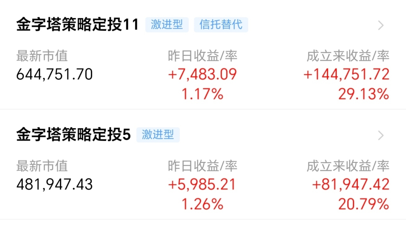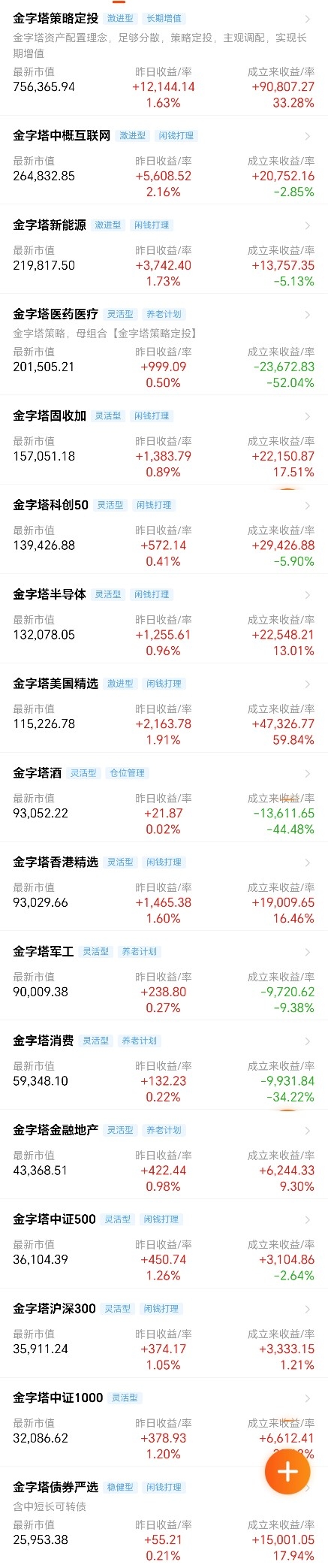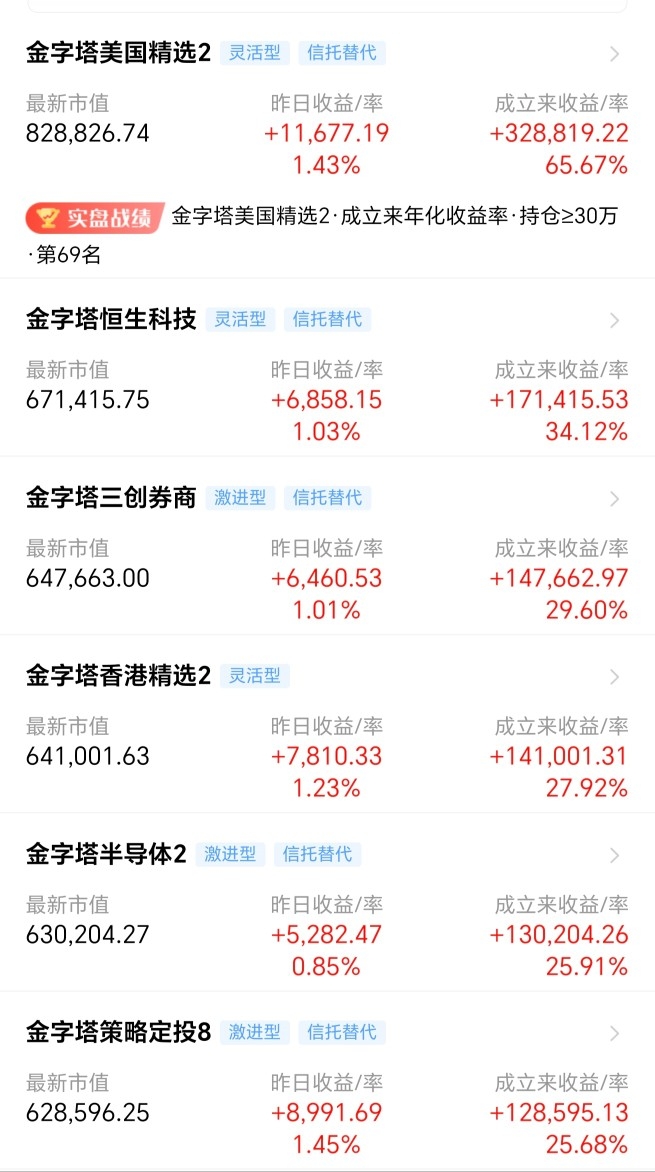 目前累计收益1740860+未公开债券收益,累计收益率排名前三的组合分别是黄金、石油、美国精选2;排名后三位的是医药、白酒、消费。收益金额排名前三的是美国精选2、恒生科技、策略定投2;排名后三的是医药、消费、白酒。