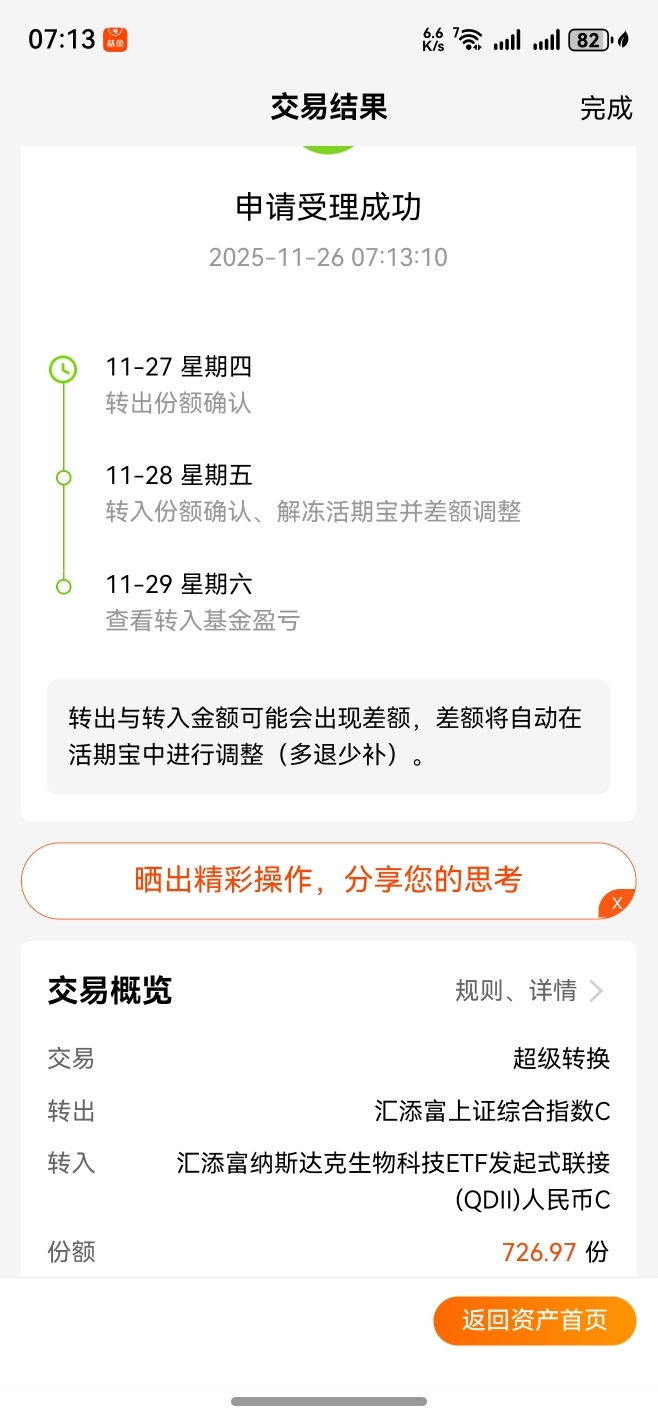 在今天,把其中九百一点持有份额资金。在今天,给考虑选择调仓转到目前持有的某个纳斯达克生物科技指数qdl基金了。