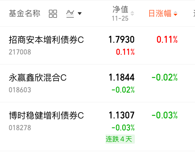 今天债券市场这边,目前早盘低开调整,利率债盘中绿色雨天为主,信用债涨跌参半,还能稍微看到一点红!不过,同为债基,混债就比较吃香了,来看看昨天部分基的表现吧!