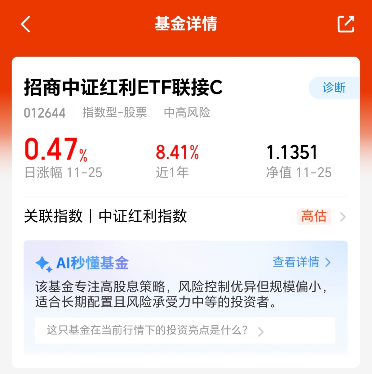今日A股市场行情再次回暖,但近期市场增量资金却不显著,从长期的角度来看,四季度行情会更倾向于价值风格,如潜力型红利板块,要知道当前高股息正处于历史低位,我也准备配置起来,其中$招商中证红利ETF联接C(OTCFUND|012644)$紧密跟踪中证红利指数,专注高股息、低波动策略,同时波动回撤控制出色,可作为安心底仓去长期持有!
