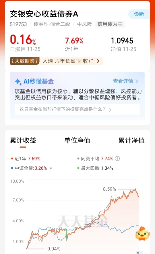安心收益债券A近1年涨7.69%,昨天日涨幅0.16%,跟同类平均差不多,还远超中证全债,连“六年长盈”都拿下了。信用债为主的配置稳了基本盘,加权益增强又拓了收益空间,最大回撤才1.34%,波动小得很。现在信用债的稳势还在,权益也有机会,这基金后续的稳收益节奏应该能延续。