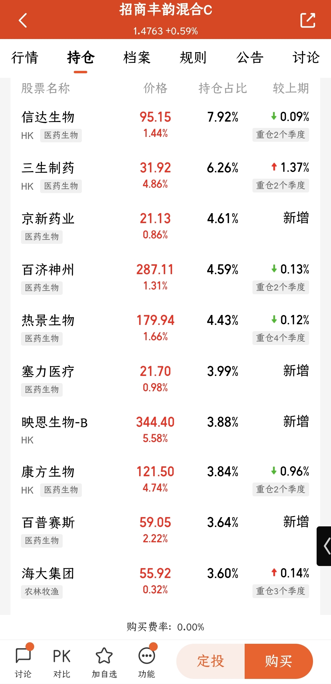 最近创新药表现不错啊,今天更是领涨全场。$招商丰韵混合C(OTCFUND|006365)$前10重仓目前全红,估值在超3个点,该基聚焦小盘创新药,反弹起来力度更猛。而且大家都知道,创新药调整也有一段时间了,估值比较合理,现在反弹行情开启,入场时机到了!