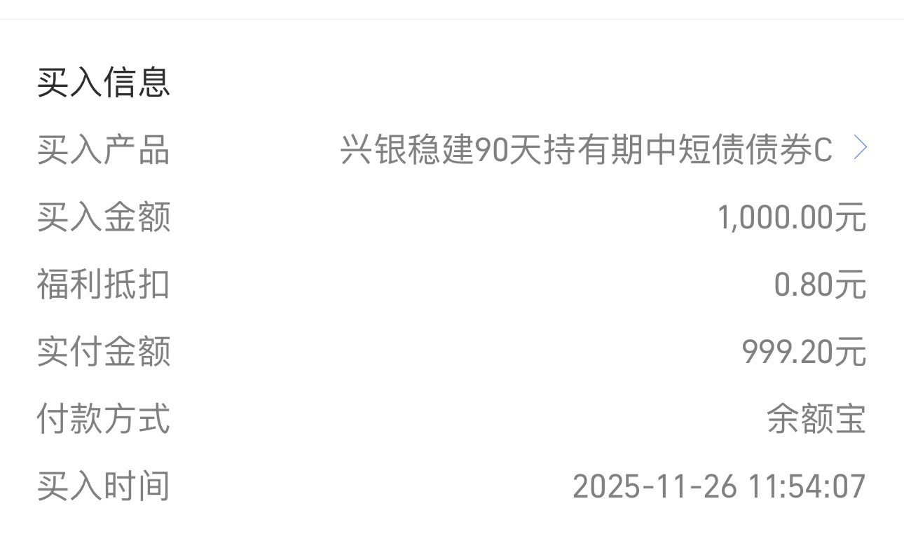 $兴银稳建90天持有期中短债C$ :小王今日继续红包1000-0.8上车,一上车就送8个蛋,我觉得在目前震荡的大环境下,上车稳健的中短债基金还是一个不错的选择,因为最近虽然行情不好,但是它依旧表现出了较好的回撤水平,昨天也是稳住没有碎蛋,对于该基金我也不用过于担心回调到来,因为回撤控制得十分优秀,再加上又有红包可以领,所以我要准备继续上车;从最新的第三季度持仓来看,信用债占比116.1%,利率债占比7.57%,两者持仓相辅相成也比较容易实现风险对冲,再加上目前YM恢复买债之后,该基金的业绩也是有了进一步的提升,而拉开长期收益来看,近一年的收益率更是达到2.88%,这样的收益率我也能接受适当波动,所以今日我要准备继续上车稳健型基金1000。