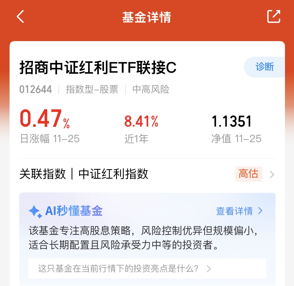 今天大盘延续反弹,盘面表现不错,中特估政策持续深化,市场行情震荡之下防御性资产更收欢迎,红利板块稳健型突出,业绩优秀,低估值高股息特征,$招商中证红利ETF联接C(OTCFUND|012644)$年化收益率8.41%,这是紧密跟踪中证红利指数的,长期持有不错的呢。$摩根标普港股通低波红利指数A(OTCFUND|005051)$ #3800点的A股值得加仓吗?#
