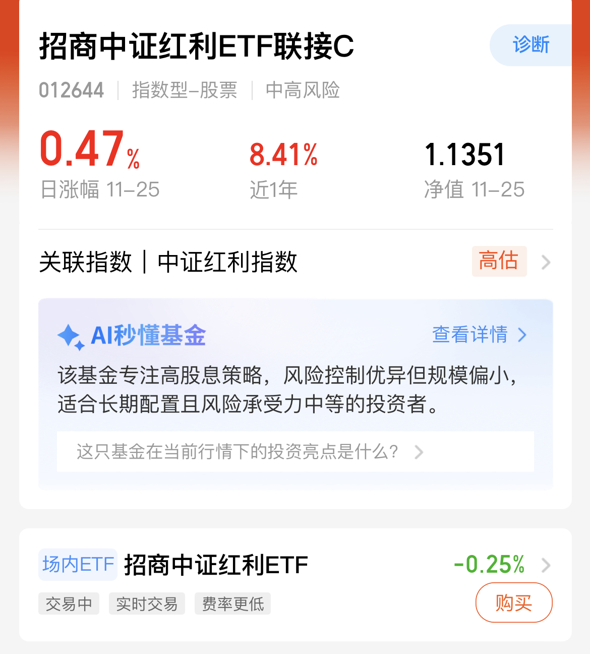 今天A股行情又回暖了,但新增资金不多,四季度更偏向价值风格,潜力红利板块挺合适的。现在高股息在历史低位,我准备配置$招商中证红利ETF联接C(OTCFUND|012644)$,它紧跟中证红利指数,主打高股息、低波动,回撤控制得不错。这只基金能当安心底仓,长期拿也稳,刚好契合现在的市场风格,我也准备布局起来,拿它当作底仓持有还是不错的。
