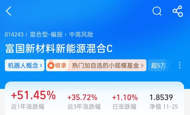 今天股市表现还是挺不错的,我也是继续布局了$富国新材料新能源混合C$ 它的表现很不错,今天估值大涨5.01%,在同类中排名靠前,它聚焦高景气赛道,紧密贴合“双碳”政策主线,重点布局新能源产业链及新材料核心领域。基金精选宁德时代等细分龙头,通过均衡配置把握行业成长红利,近1年收益表现亮眼,在同类产品中具备竞争力。