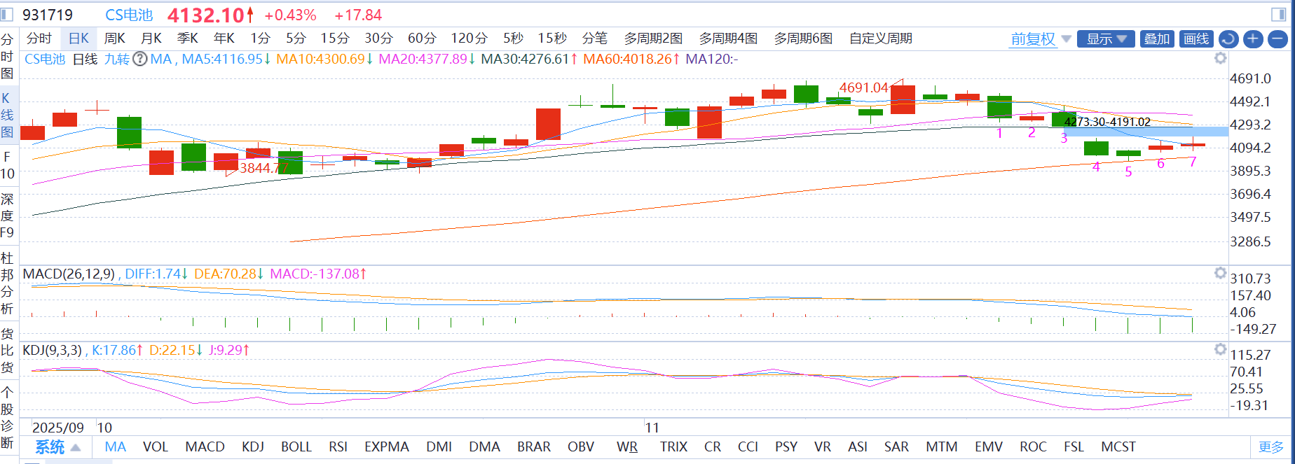 电池:锂电指数沿60日线攀升,今日量价配合良好,继续看涨,但午后随冲高回落,麦爸选择持仓躺平观望。