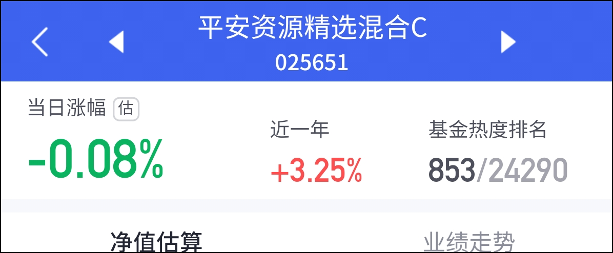 $平安资源精选混合发起式C$ 昨天涨了2.13%,今天预估跌0.08%