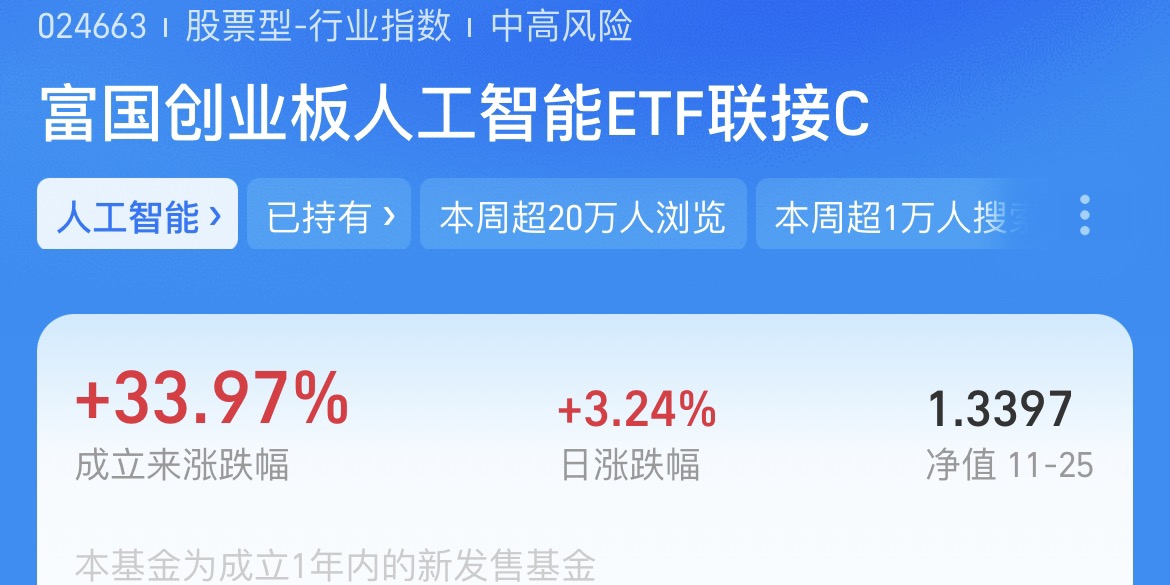 今天市场行情向好,科技板块涨幅居前,与科技相关的细分领域,涨幅都还不错。其中包括主线之一的人工智能,$富国创业板人工智能ETF发起式联接C$ 跟踪创业板人工智能,今天创业板指领涨指数,涨幅超2个点,从芯片到新兴应用的全面爆发,也大幅度抬升了行业景气度。它紧跟人工智能赛道,聚焦科技龙头,发展潜力和修复能力较强。昨日上涨3.24%,今天估值保持上涨,又要吃肉了。成立以来涨幅33.97%,从行业发展以及政c支持看,前景不错,继续布局了
