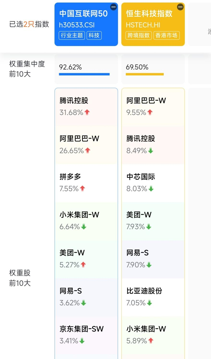 个股波动太大,可以看看阿里知名度比较高的恒生科技和中概互联指数,两者成分股重合度极大,最大区别就是中概互联头部集中度大,而恒生科技持仓更均衡,看好恒者恒强看选择,均衡配置看后者。
