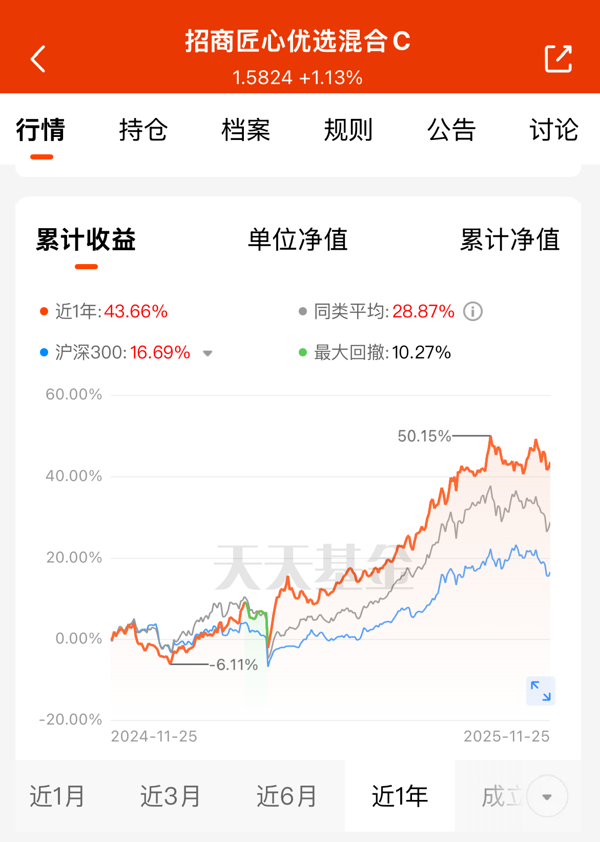 这三天基本上把周五的跌幅给拿回来了,但是前面的跌幅还差点,我接下来均衡方面也要配置一些,单调一个赛道追不上轮动的速度。$招商匠心优选混合C(OTCFUND|017965)$今天估值涨1.5%,还不错,近一年43%,创新药踩中政策扶持+国产替代风口,黄金当避险盾牌,有色抓战略资源涨价红利,三大方向均衡搭配,继续看好。