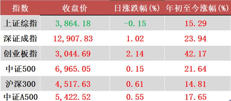 国内主要股指涨多跌少。截至收盘,上证指数跌0.15%,收报3864.18点;深成指涨1.02%,报12907.83点;创业板指数涨2.14%,收报3044.69点。两市成交额17833亿元。行业方面,申万一级涨少跌多,通信领涨,涨幅为4.64%;国防军工领跌,跌幅为2.25%。