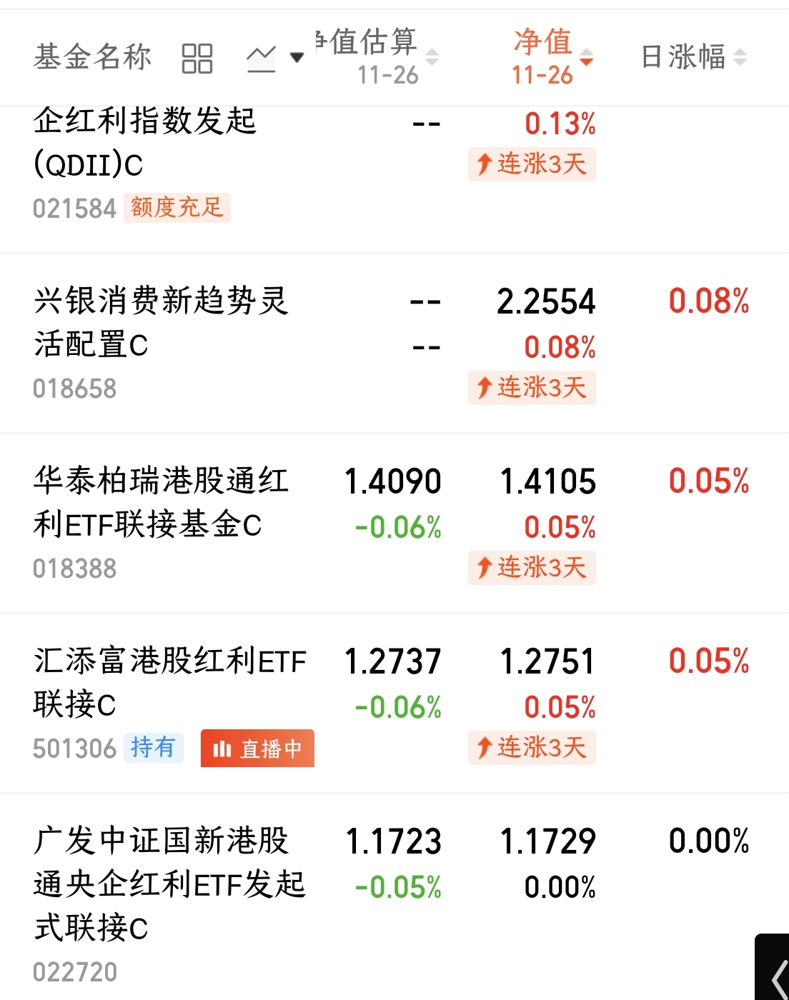 $华泰柏瑞港股通红利ETF联接基金C(OTCFUND|018388)$今日上涨0.05%