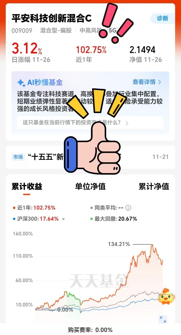不知道小伙伴有没有发现,今天创业板指涨超2%,但是市场赚钱效应却不是很好,如果你手上没有持有CPO概念相关基金,那么今天你有可能是要赔钱的,小曾今天收益就差点亏损,所以持有一只科技板块的混合基金是很有必要的,里面最好重仓了CPO、PCB和半导体等板块,而平安科技创新混合C今天直接收涨3.12%,长期收益也很亮眼,科技主线回升趋势下配置价值凸显,继续看好!