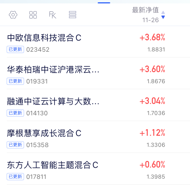 今天大盘又涨起来了,整体行情依旧吃肉,从盘中来看,科技相关的信息产业、云计算、人工智能等方向表现亮眼,接下来看部分基的净值概况吧!