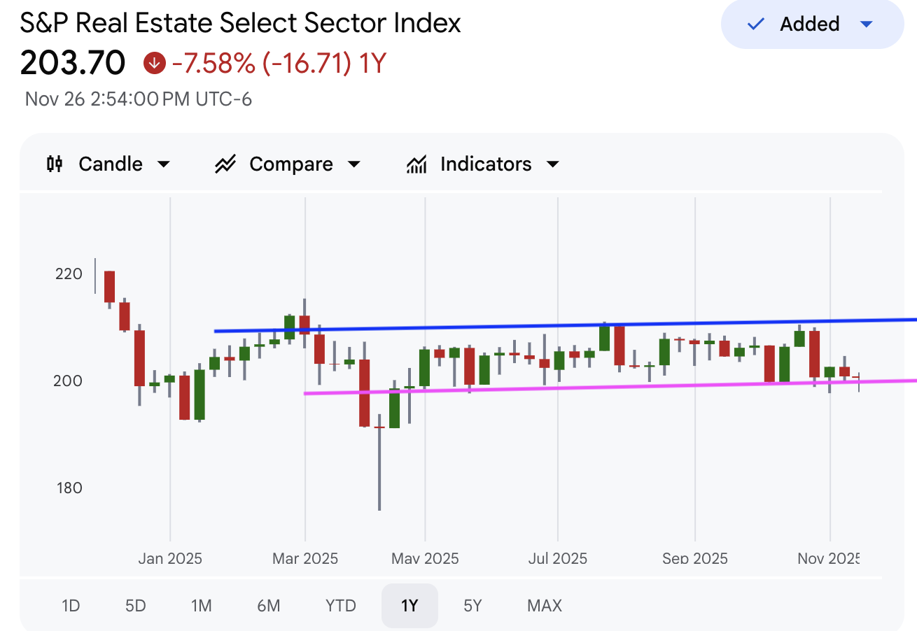 标普房地产板块:房地产板块近期在关键支撑位附近反复震荡,走势尚未明确。若跌破支撑位,可能面临新的压力;但目前仍维持在支撑位之上,市场方向有待进一步确认。