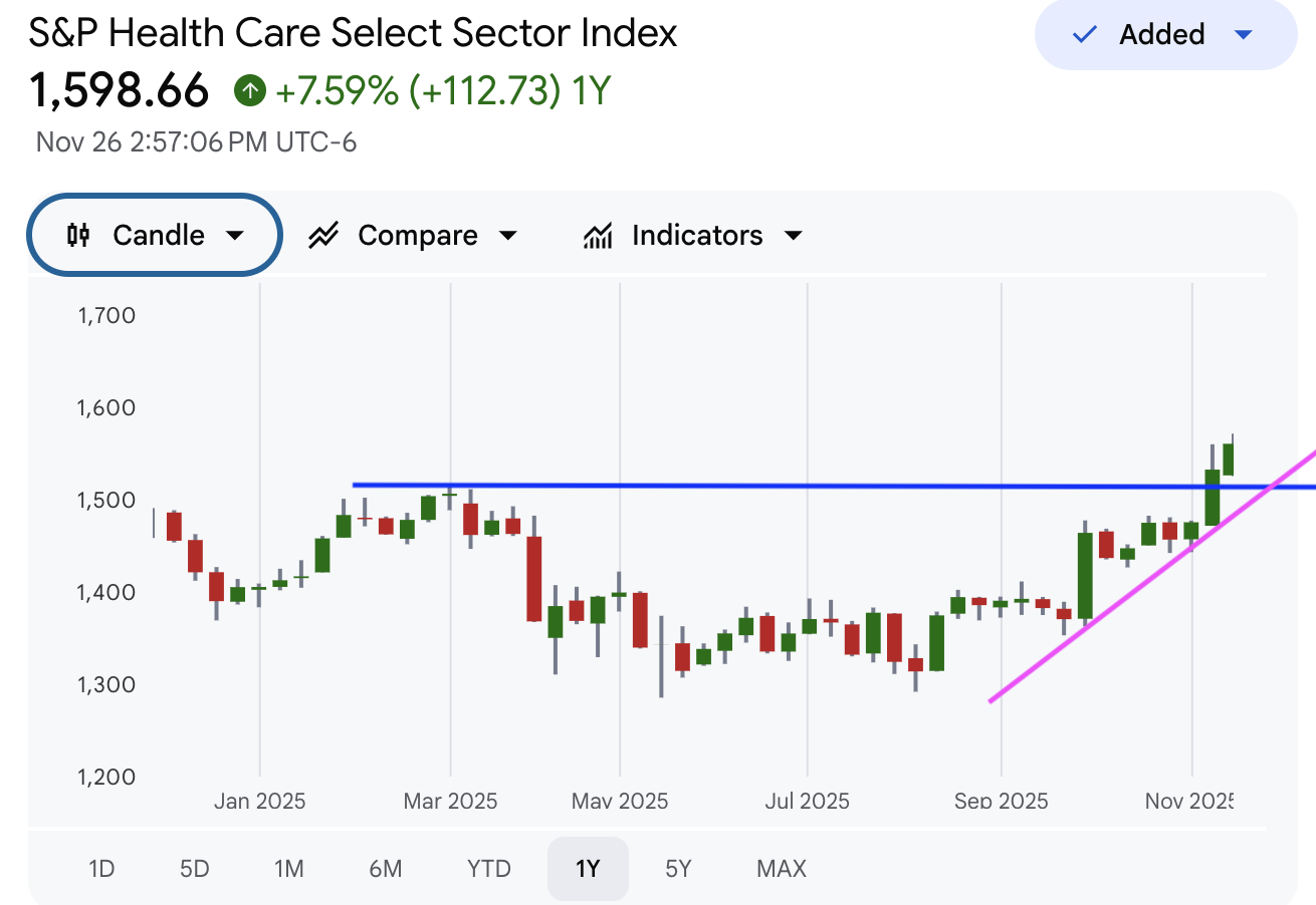 标普生物板块:生物板块近期上涨幅度较大,短期出现一定回调,但整体仍保持相对强势。距离历史高点仍有空间,显示资金对生物科技的关注度持续。