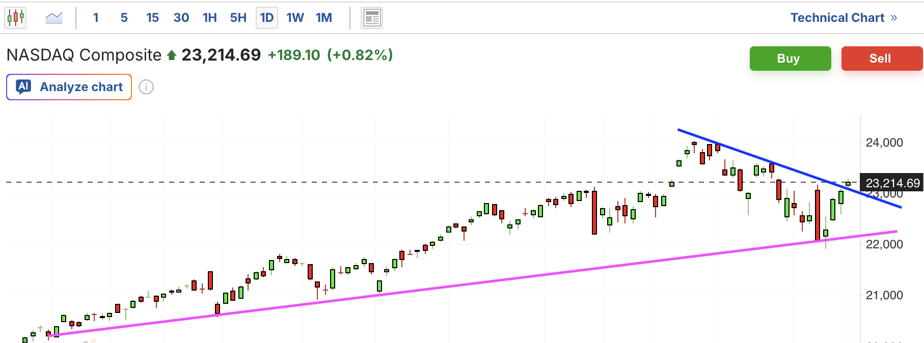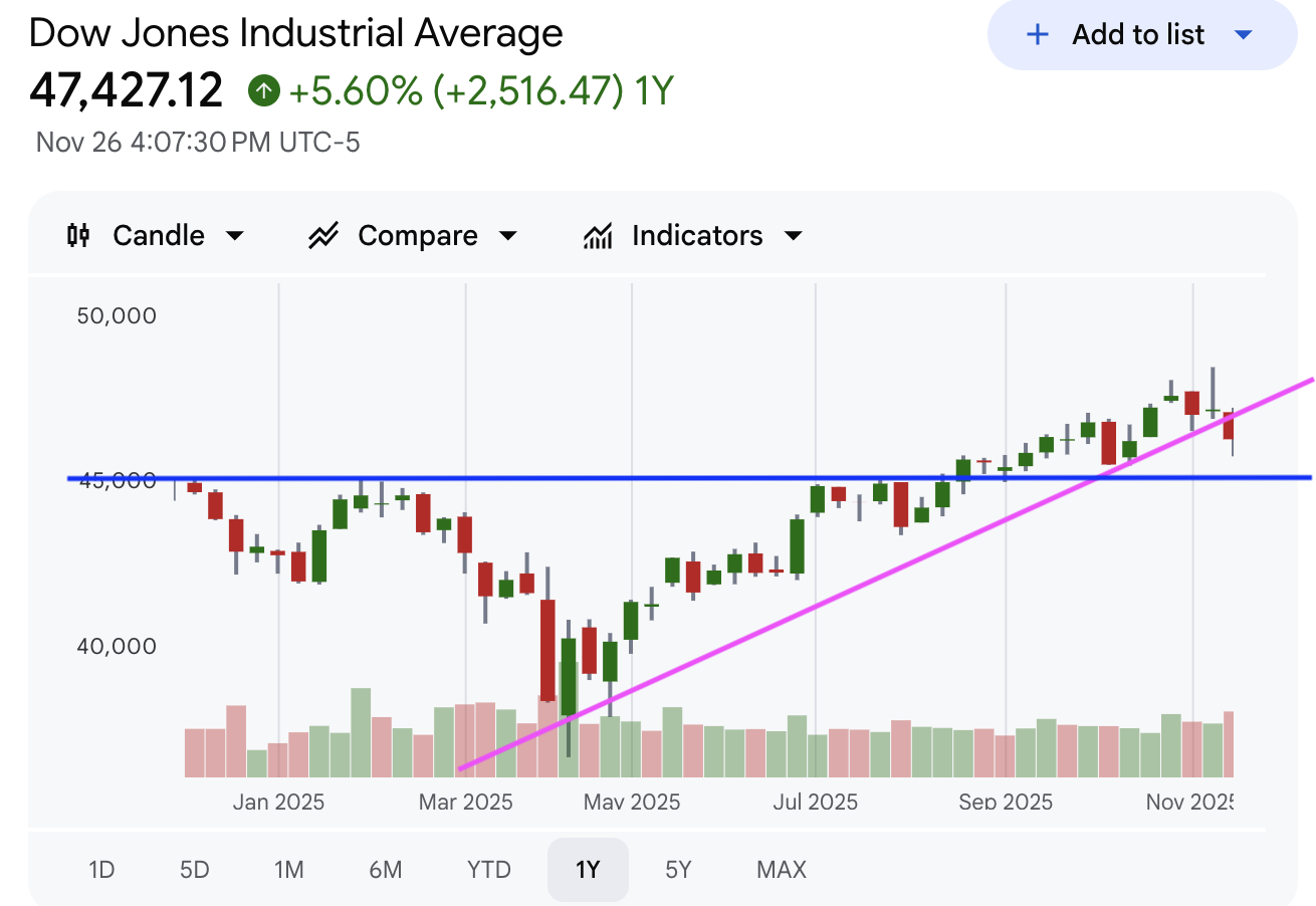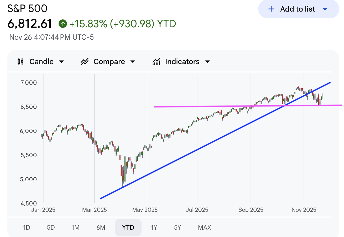 整体氛围:美股在感恩节假期前夕延续上涨势头,连续四个交易日走高。这种节前上涨往往反映市场情绪的改善和资金的积极布局。技术面表现:主要指数(道琼斯、标普500、纳斯达克、罗素2000)收复了 50 日均线,并突破了 10 月以来的下跌趋势,短期市场压力有所缓解。板块轮动:科技板块在经历多轮下跌后出现明显反弹,公用事业和材料板块也表现突出,显示资金流入较为分散。其他市场:比特币接近 9 万美元,反映风险偏好增强;原油价格回升,显示能源需求预期改善;美债收益率维持在 4%,说明资金并未大规模撤离债市。