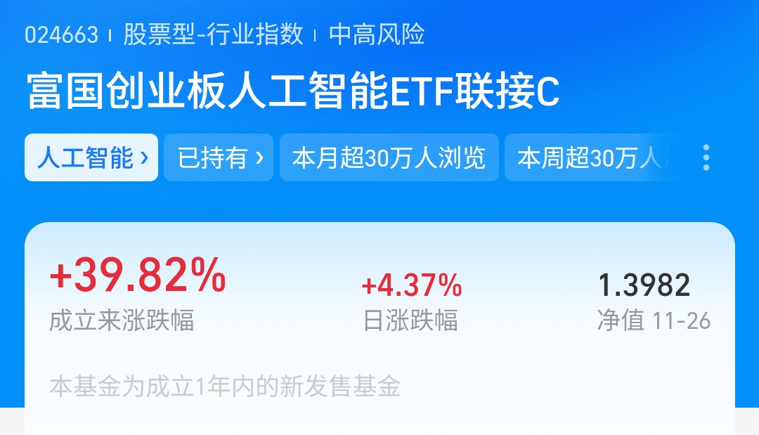 $富国创业板人工智能ETF发起式联接C$ 创业板人工智能方向,它的CPO含量给得很足,踩中当下算力驱动的产业风口。成立以来涨了39.82%,昨日还逆势大涨4.37%,弹性和稳定性都在线。看着赛道逻辑越来越清晰,我今天也跟着补了1000,毕竟全球算力需求还在激增。