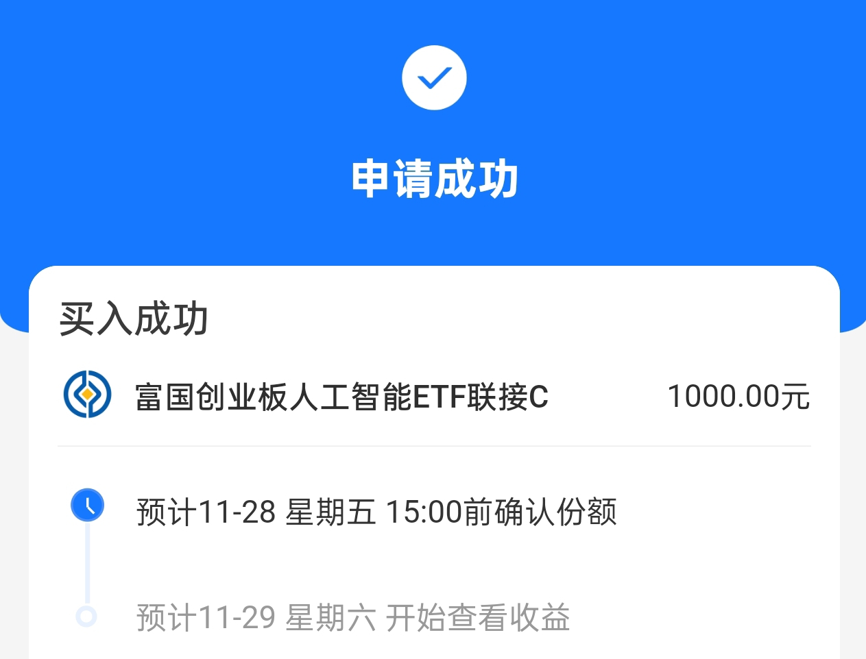 我上车了$富国创业板人工智能ETF发起式联接C$ 该基金对关注AI赛道的我来说特别友好。作为紧密跟踪创业板人工智能指数的产品,它能贴合AI全产业链的创业板优质标的,让我平缓分享赛道成长带来的红利。昨天4.37%的涨幅带来了小惊喜,成立以来近40%的累计涨幅,也慢慢印证了它的阶段性收益潜力。基金经理在指数跟踪方面经验扎实,会尽力控制跟踪误差,帮我更精准地把握AI板块行情。如果长期看好AI产业的发展前景,这只基金会是很合适的选择,温和适配对Al赛道感兴趣的投资需求。