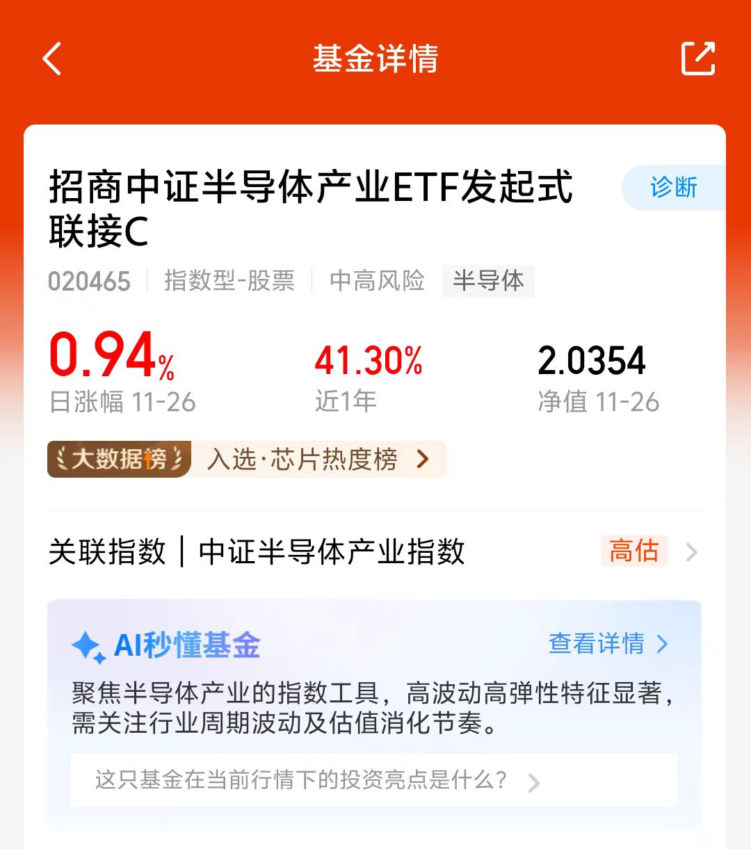 半导体板块近期表现还不错,今天继续小幅上涨,$招商中证半导体产业ETF发起式联接C(OTCFUND|020465)$昨天涨了0.94%,今天预估涨0.32%,近六个月涨了43.54%,半导体板块长期来看行业需求旺盛,发展空间还很大,长期看好这个方向,我准备分批加仓了!