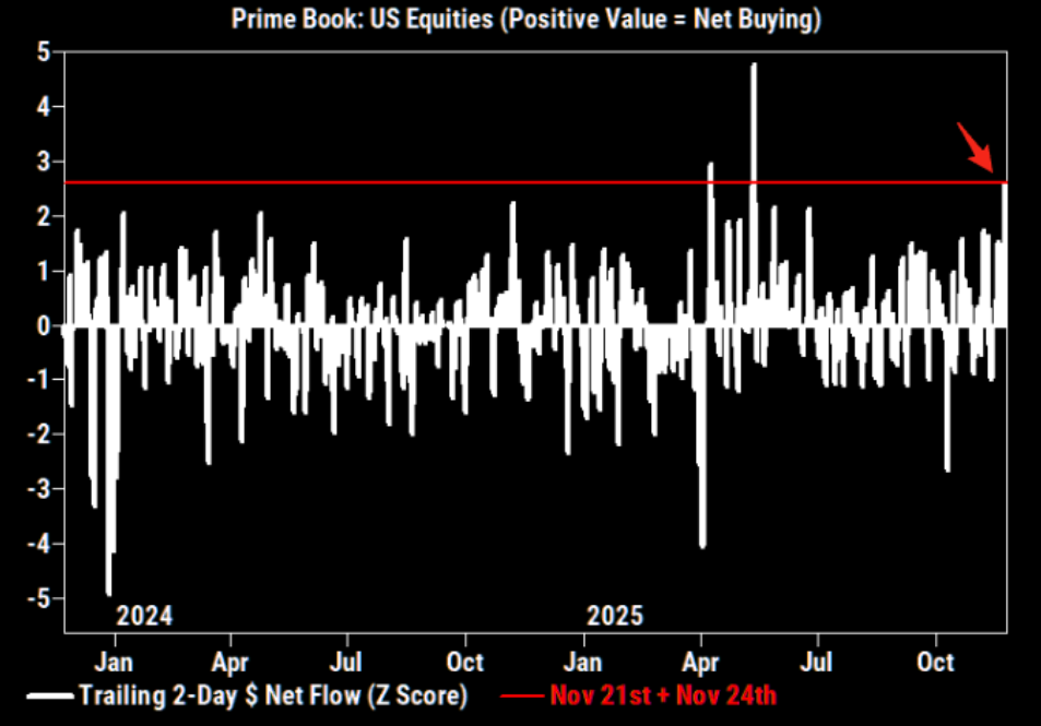 不过,AI内部的分化,以及叙事的变化,不改变整体的强力反弹,昨晚,费城半导体指数大涨近3%,本周4个交易日,累计反弹已经超过10%,非常猛,而从交易数据来看,上周在流动性冲击的过程中,因触发阈值而造成市场大跌的美股对冲基金,在上周五、本周一,大幅回补股票仓位,创半年来最高的两日净买入,这种回补行为,也是导致大盘修复,科技股反弹的主要原因。