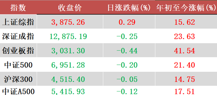 国内主要股指涨少跌多。截至收盘,上证指数涨0.29%,收报3875.26点;深成指跌0.25%,报12875.19点;创业板指数跌0.44%,收报3031.3点。两市成交额17007亿元。行业方面,申万一级涨少跌多,轻工制造领涨,涨幅为1.09%;综合领跌,跌幅为2.34%。