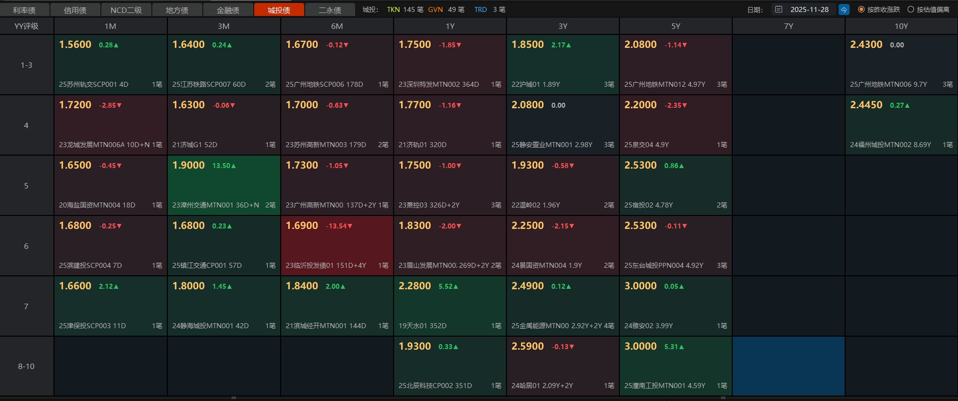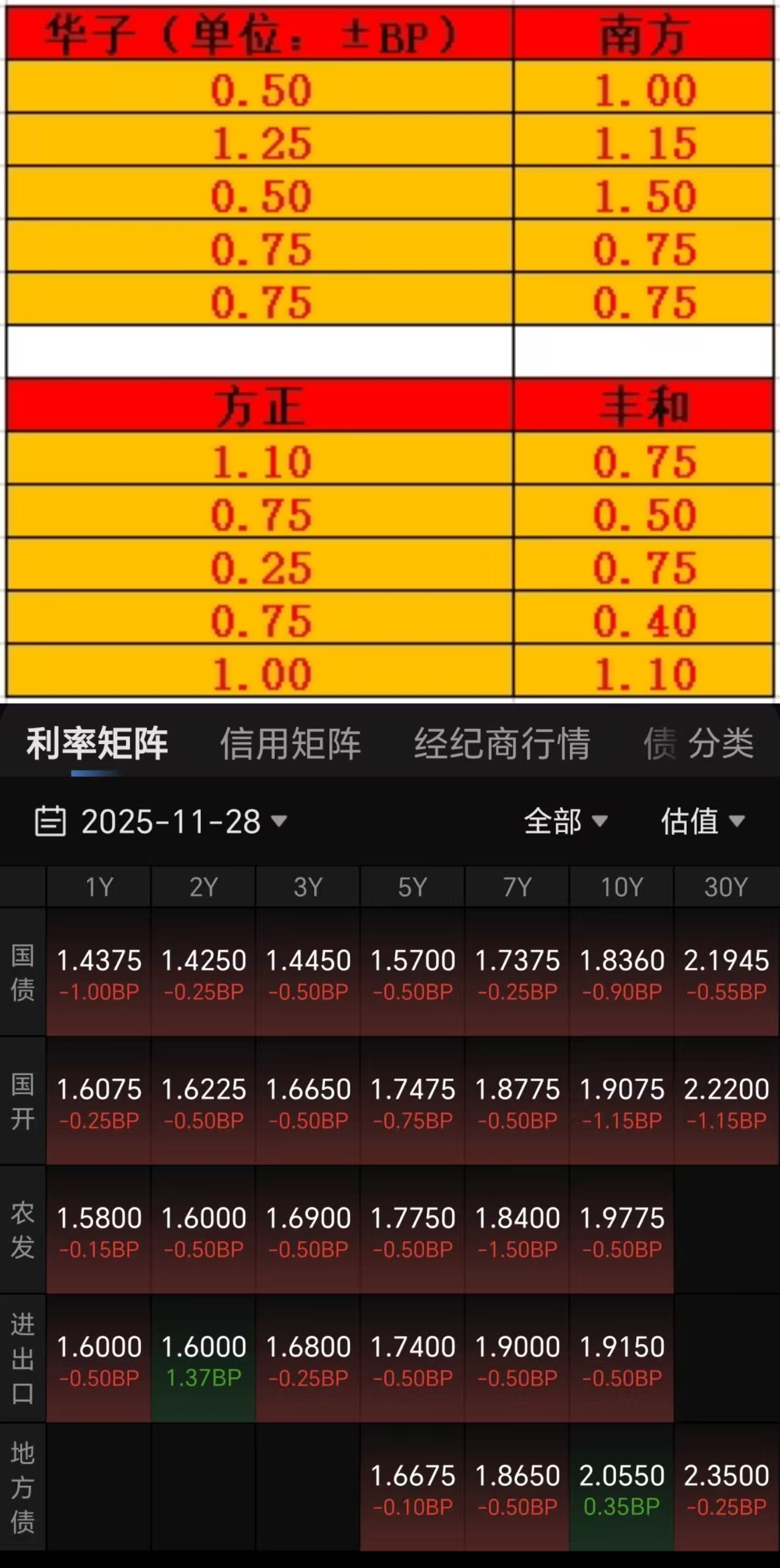 11月28日债市午间天气播报:上半场隔壁大盘起起落落的,核心问题还是量能跟不上。指数和可转债目前又拉起来了,个股3568家上涨,1626家下跌。债市冲高回落,10:30后基金转为卖出,证券是买方主力,下午行情怎么走,还得看证券的动作。利率债小反弹,后续我打算边打边退了。下周就到12月初了,信用短债我打算继续持有。午间情况:7-10年期收蛋7-10个,超长期国债轻仓收蛋14个左右(华子),重仓收蛋15-22个(丰和<方正)。