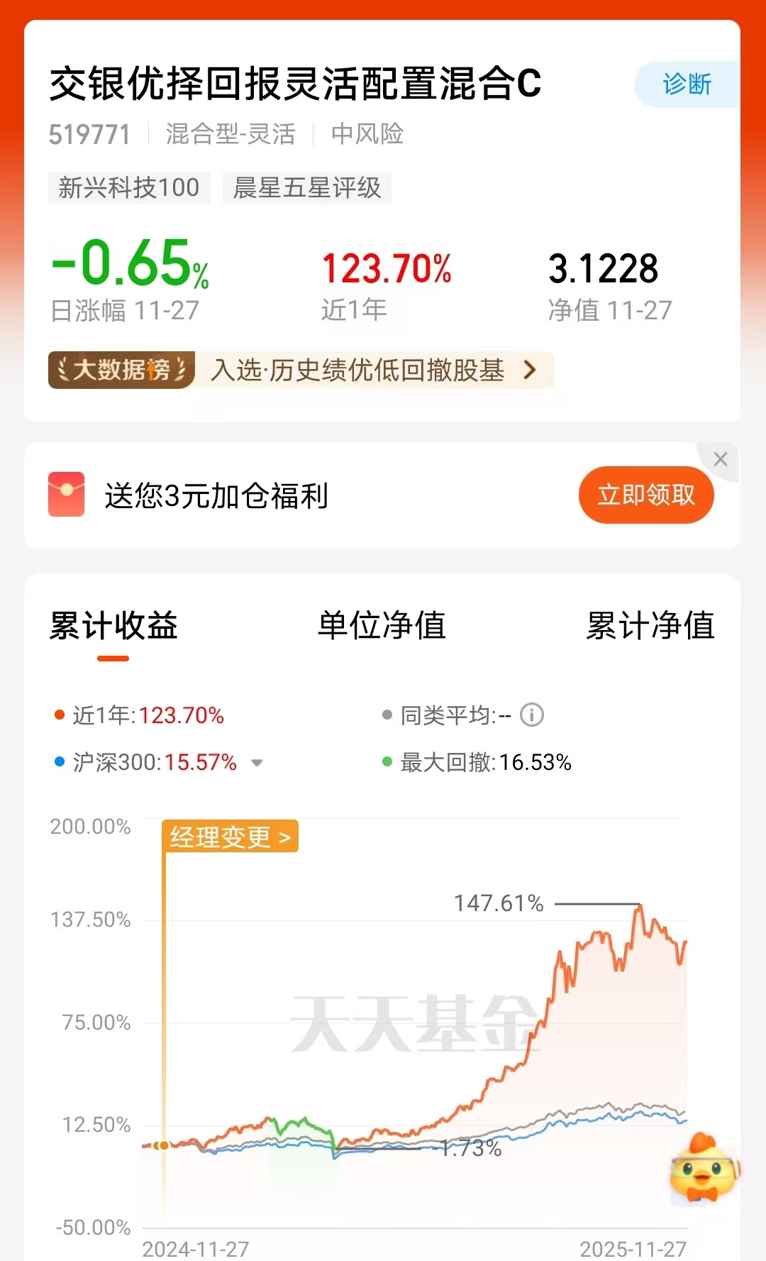 交银优择回报C近一年123.70%的涨幅太亮眼了,昨天虽然跌了一点,但净值3.1