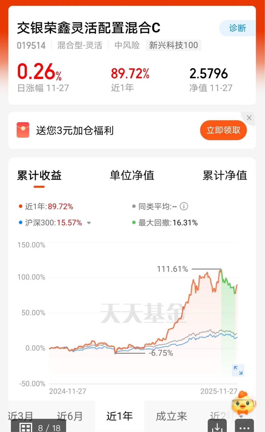这基金近一年89.72%的涨幅真扎实!昨天还涨了0.26%,比沪深300和同类平均强出不少。灵活混合就是能跟着高景气跑,不用被动吃跌。看这走势从去年到现在一路往上,它持仓的行业后续还有机会,只要调仓不踩错,后面接着冲的概率不低。$易方达成长动力混合C$ $永赢科技智选混合发起C$