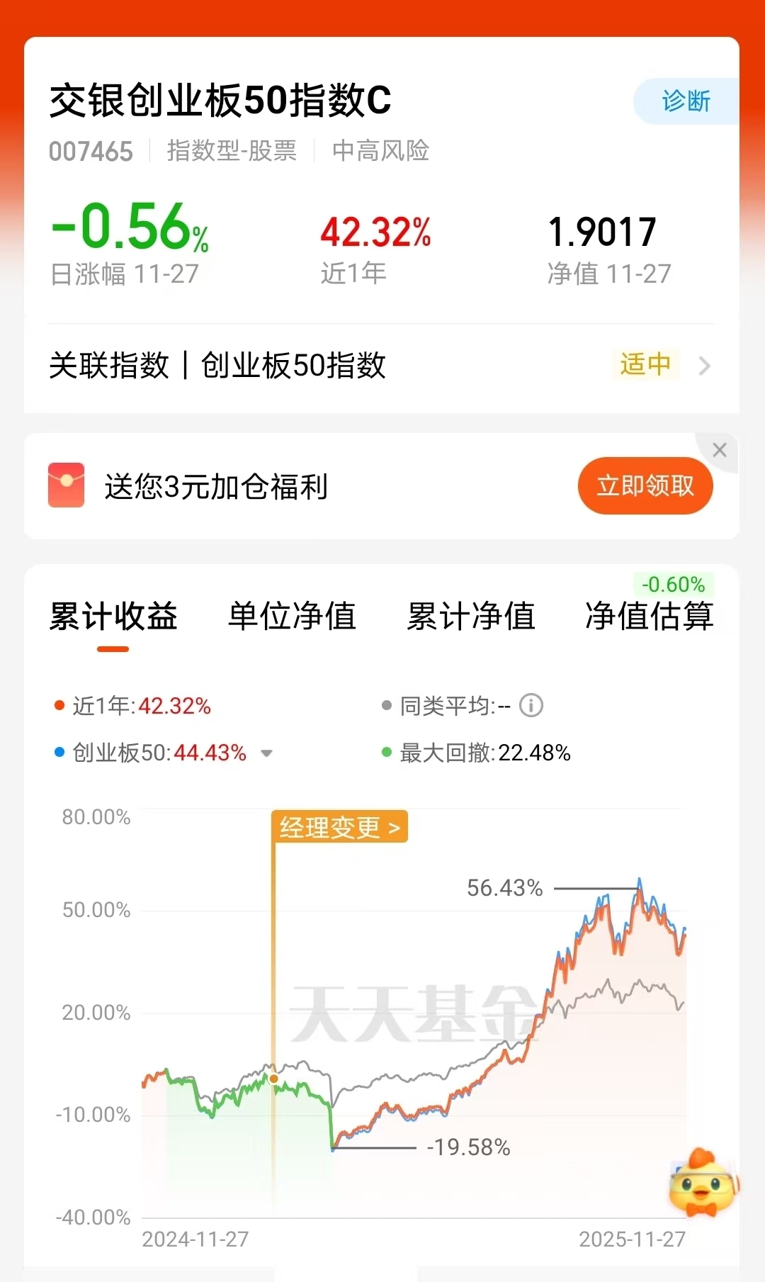 这指数基金近一年涨42.32%,昨天小跌0.56%不算啥,虽说没跑赢对应的创业板