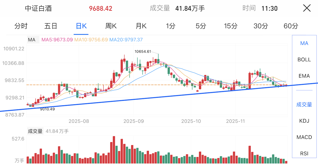 白酒:持续在底部区间震荡,近期守住关键支撑位,但整体波动幅度较小,成交量也有所减少,暂未出现明显的回升迹象。