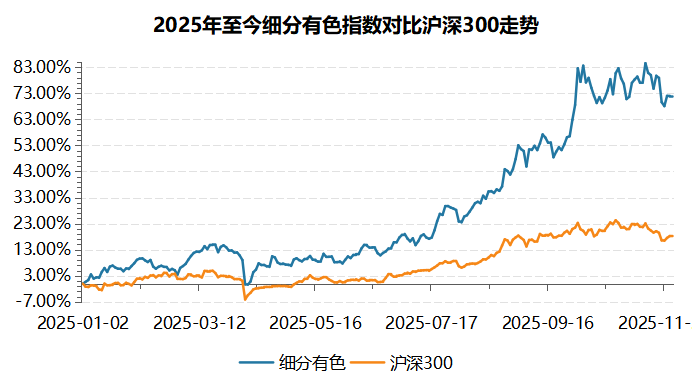 数据来源:choice,数据区间为2025.1.1-2025.11.27。中证细分有色金属产业主题指数代码为000811,沪深300指数代码为000300。指数过往表现不预示未来,亦不代表相关基金表现