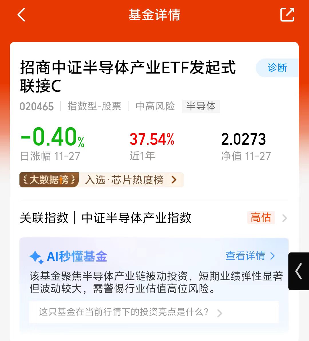 大盘今天涨起来了,半导体今天V字拉升,盘中涨幅超2%。$招商中证半导体产业ETF发起式联接C(OTCFUND|020465)$目前预估涨幅1.75%,近六个月涨了43.95%,业绩还不错,长期来看半导体板块发展前景很不错,后续空间也比较大,看好这个方向,我准备分批布局!