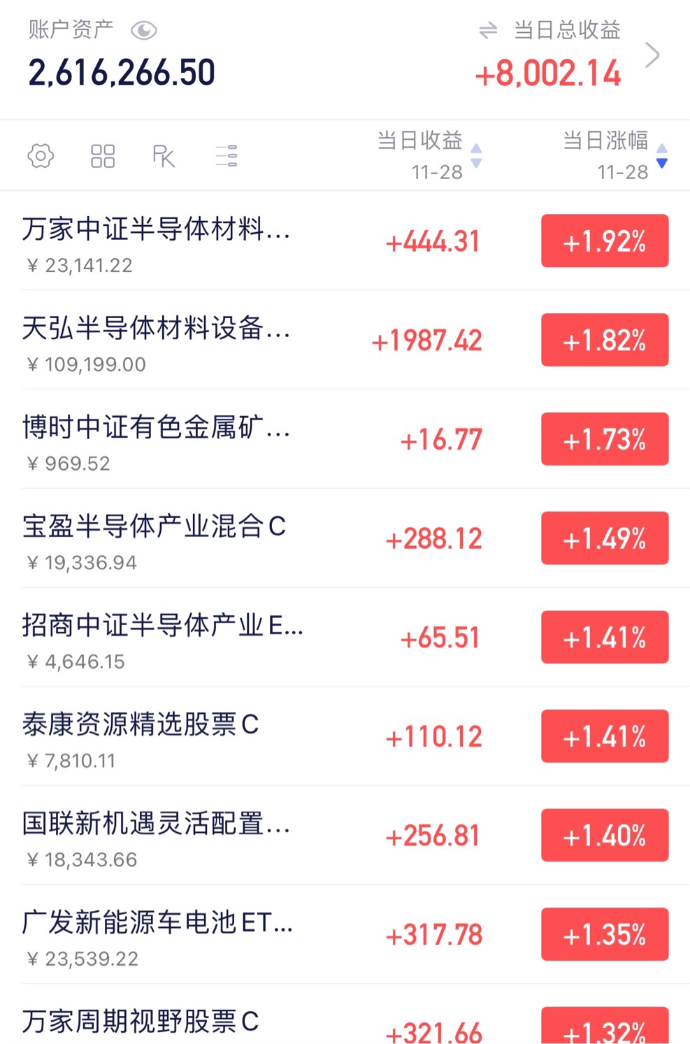 4. 半导体芯片,上车2000,$天弘芯片产业ETF联接C$ 今天半导体芯片大口吃肉,平均上涨超过2%,主要集中在半导体设备材料和半导体产业指数,我认为:半导体指数处于黄金坑位置,一方面,这一波上涨高度对标存储芯片、算力芯片还有很大的空间,另一方面,调整到15%,进一步提出了泡沫筹码变得更便宜了。