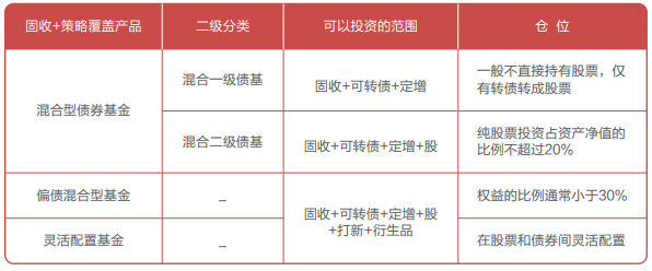 尽管“固收+”没有官方的界定标准,从已发行的产品来看,“固收+”的涵盖范围按照持仓类别,大致可以分为混合一级债基、混合二级债基、偏债混合型基金、灵活配置基金等。所以说,“固收+”和偏债混合基金不能完全划等号。