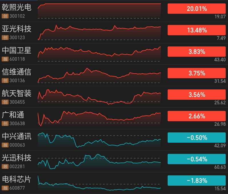 可以看出卫星是个杂交品种,他主要是军工+通信+芯片,他今天的涨幅却比这三个板块都多。