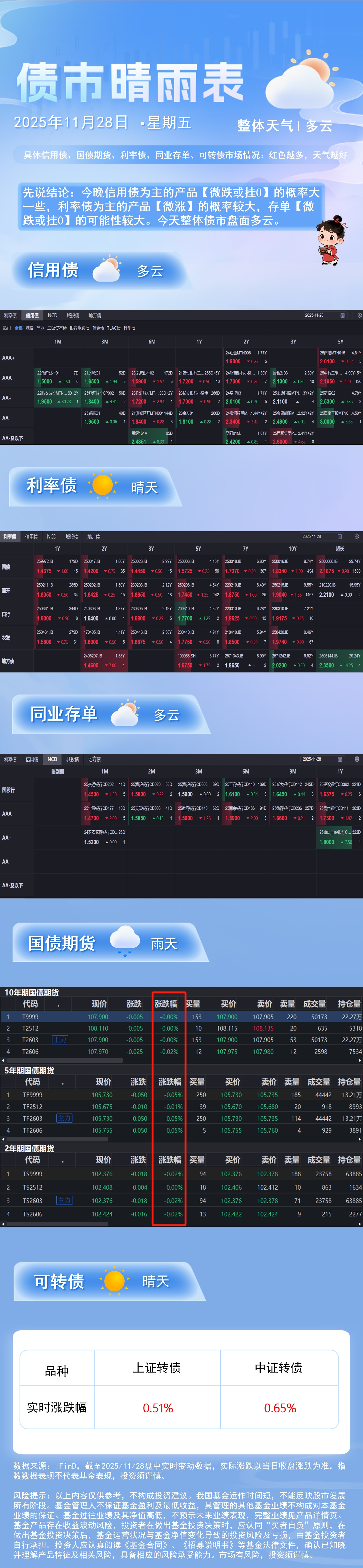 先说结论:今晚信用债为主大的产品【微跌或挂0】的概率大一些,利率债为主的产品【微涨】的概率较大,存单【微跌或挂0】的可能性较大。今天整体债市盘面多云