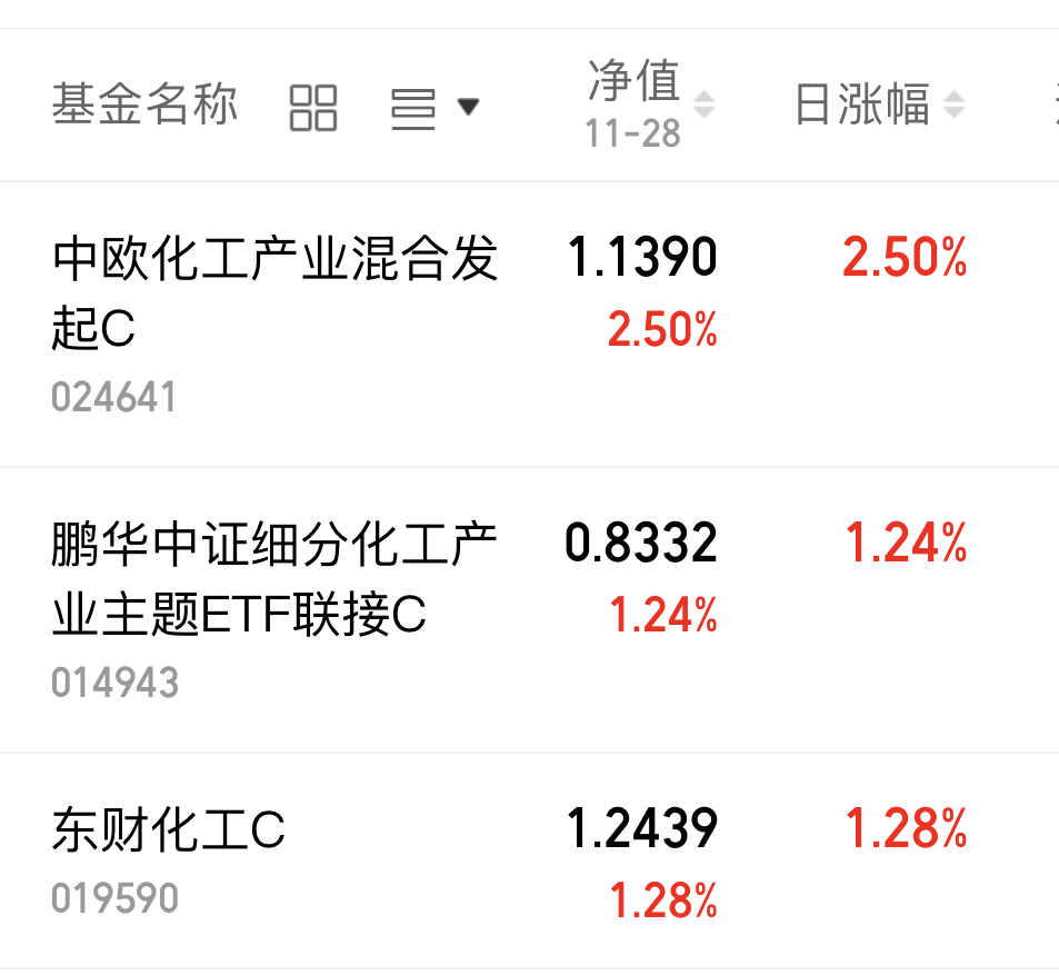 今天大盘行情不错,三大指数集体上涨,化工板块最近表现不错,今天也是一路领涨,一起来看净值情况。