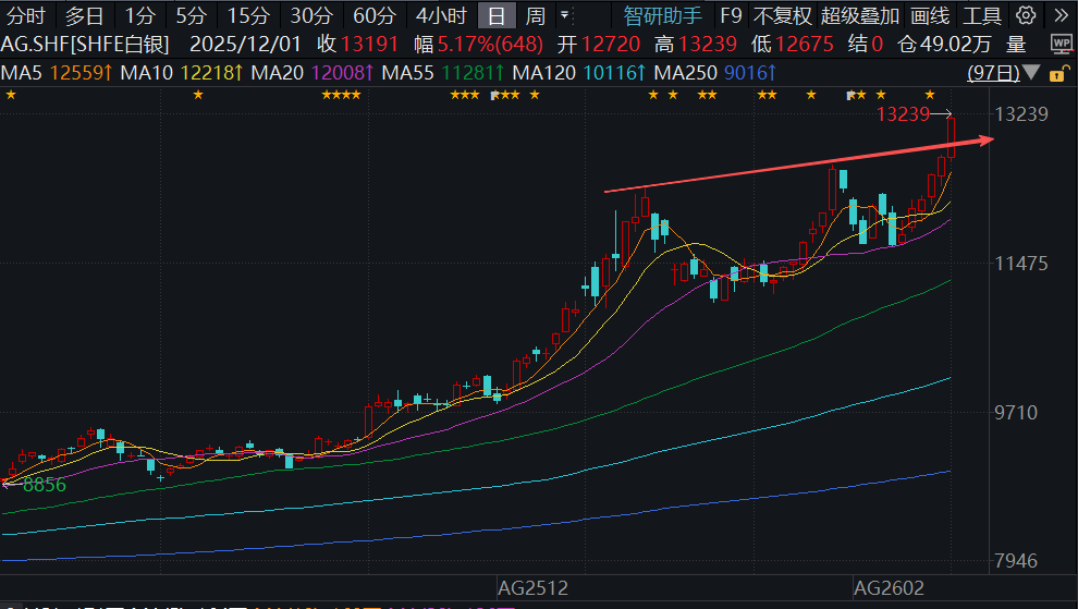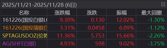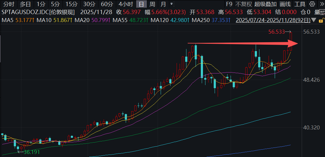 伦敦银现货涨11.36%,本周五11月28日创下56.4美元的历史新高。