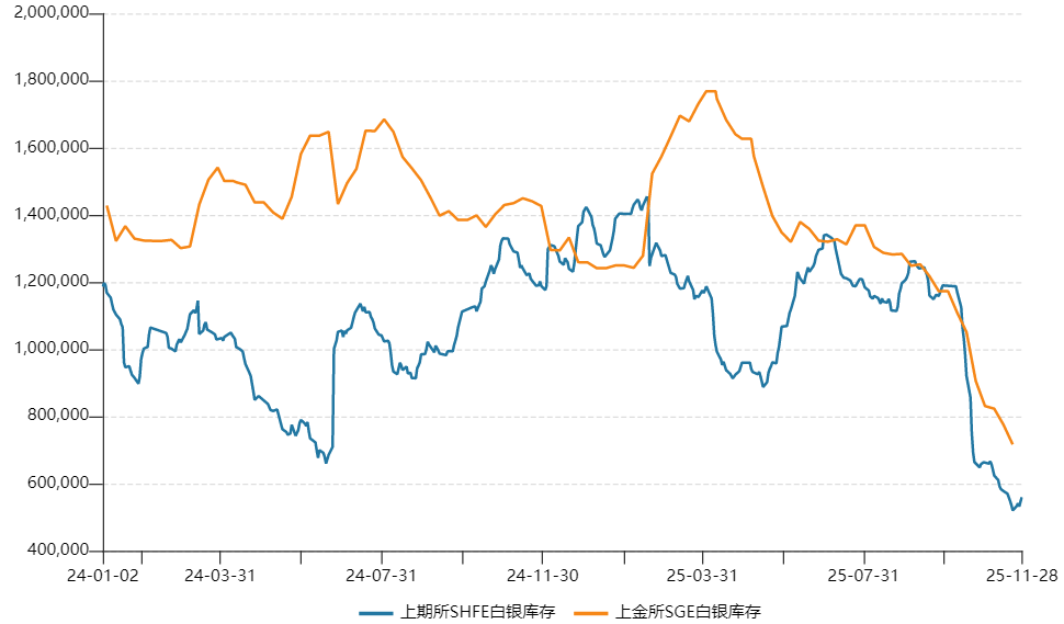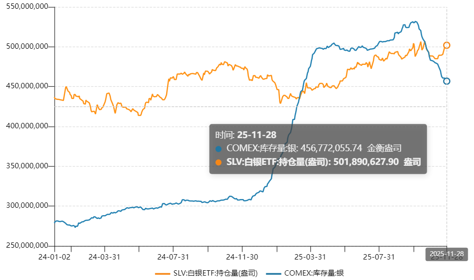 需要说明,直接这么比较不太严谨,因为ETF除了可以在纽约买现货,还可以在伦敦买。但是另一方面说,市场上持有白银的ETF也不止这一只。数据上看,comex同样库存快速下降是跑不了的。从10月初高点到现在一共下降了7500万盎司,约合2340吨,比上海的库存下降更多。