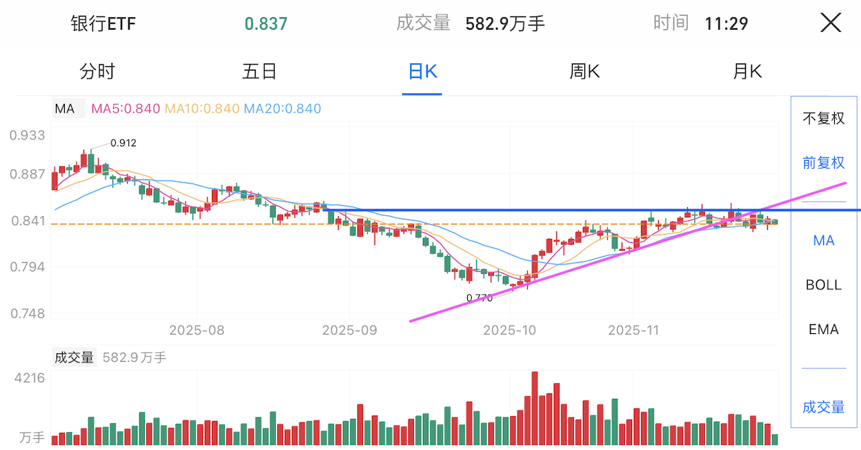 银行:板块在下行过程中出现反弹,但随后停滞,跌破趋势线后进入横盘震荡。方向暂不明朗,需关注资金流向与政策环境。若能企稳,将对大盘形成一定支撑。