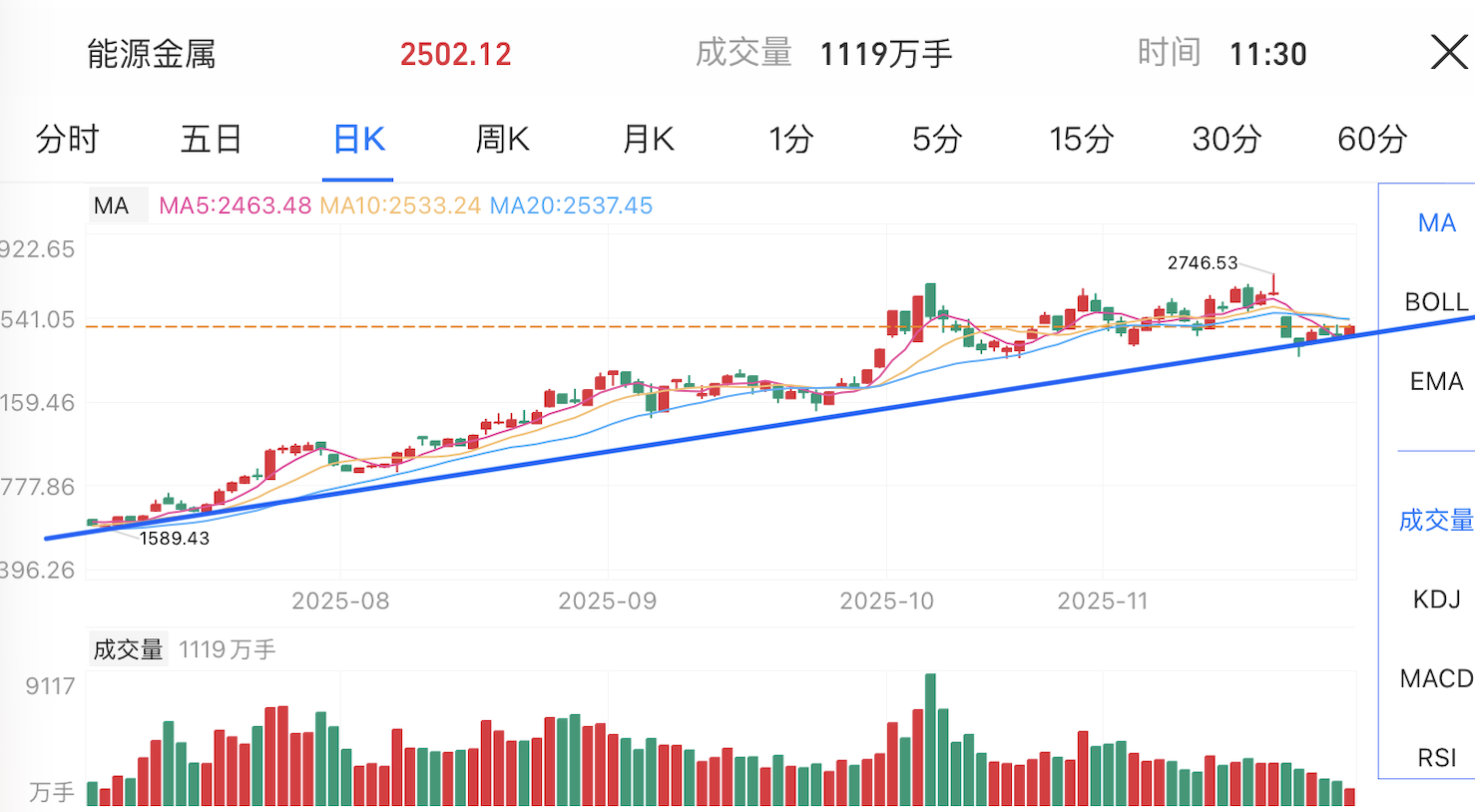 能源金属:板块进入整理阶段,价格回落至前低支撑区域,短线止跌迹象出现,但成交量不足。若资金流入增强,有望形成趋势性反转;否则仍维持弱势震荡。需关注国际商品价格与政策驱动。